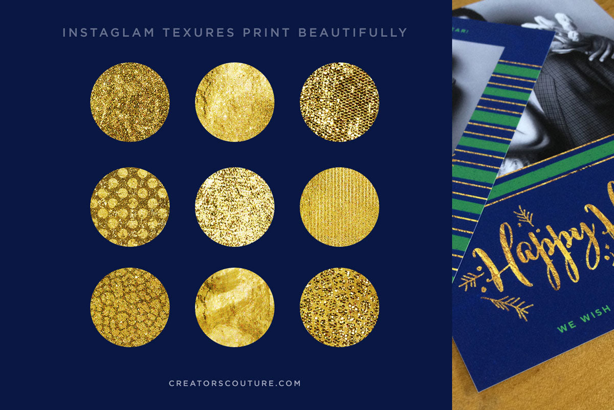 InstaGlam is a tediously created and beautifully unique set of seamless gold foil and metallic gold inspired textures turned 1-click layer styles for Photoshop that let you instantly apply these stunning styles in any color or rich gold. You have limitless options, but it's not overwhelming, just fun!